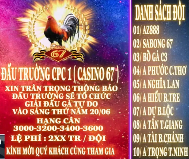- Địa điểm: Bồ Gà CPC1 (Casino67)